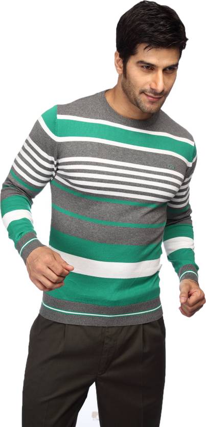 Men Striped Round Neck Cotton Blend Green T-Shirt