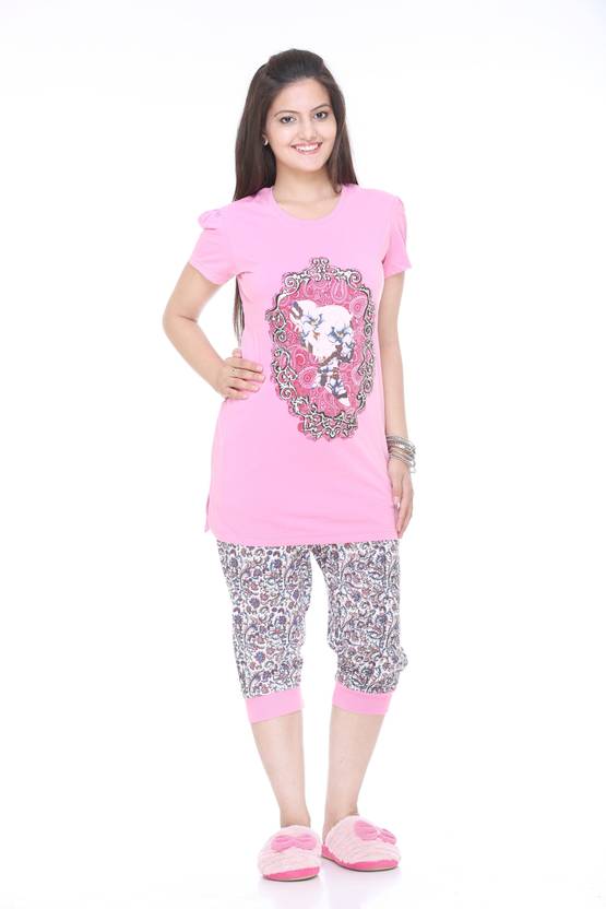 It'S Time To Buy A Proper Sleep Wear That Offers You Comfortable Fit And It'S Soft Fabric Ensures That You Sleep Through It Like A Baby. You Are Sure To Look A Sleeping Beauty Wearing This Puffed Sleeve, Elegant Printed Top Paired With A Contrast All-Over Printed Capri Having A Ribbed Bottom By Colors & Blends. Further, The Side Pockets Ensures High Functionality, Keeping Your Mobile, Money And Other Valuables Safe, Specially While You Are Out For A Walk, Doing Excercise Or Riding A Two Wheeler.