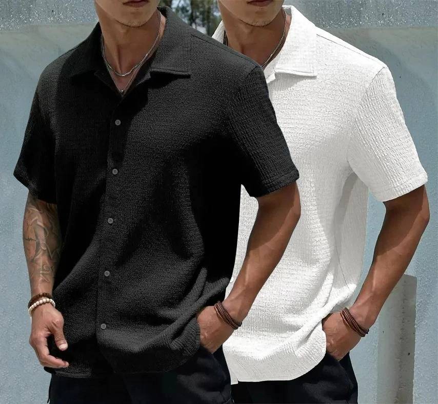 A men's popcorn shirt is a uniquely textured garment that resembles popped corn kernels. These shirts are typically lightweight and stretchy, with a crinkled or wrinkled appearance. They often feature a relaxed fit and come in a variety of colors and styles. The fabric is usually made from materials like polyester or a blend of synthetic fibers, giving it a soft and comfortable feel.