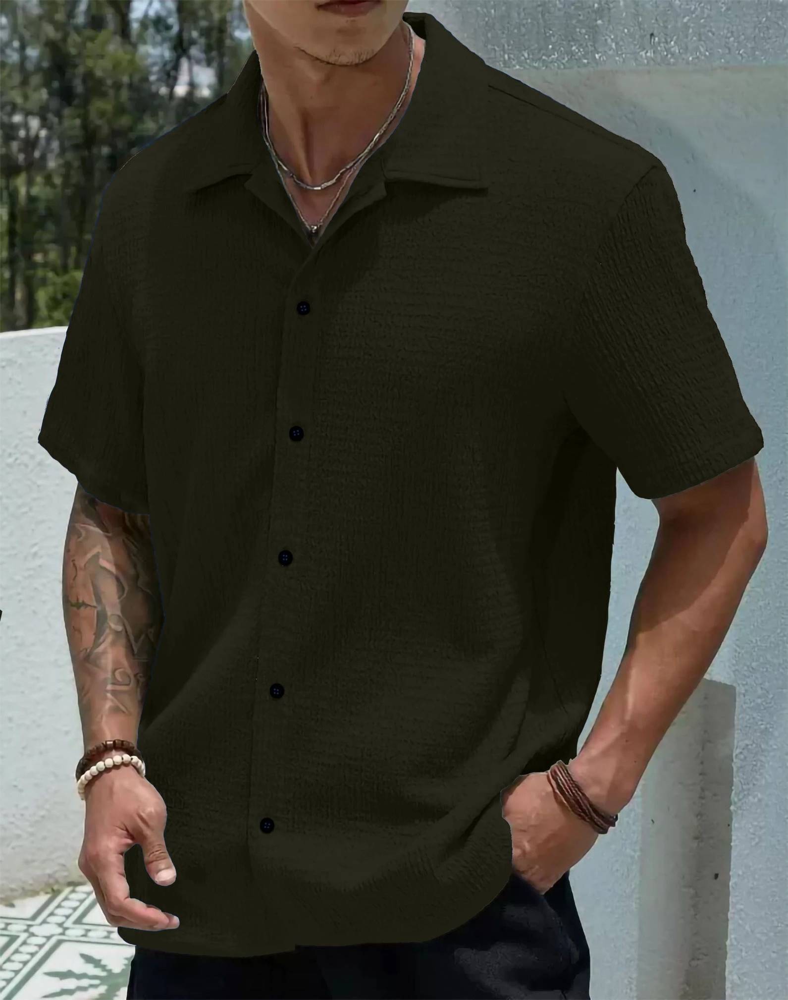 A men's popcorn shirt is a uniquely textured garment that resembles popped corn kernels. These shirts are typically lightweight and stretchy, with a crinkled or wrinkled appearance. They often feature a relaxed fit and come in a variety of colors and styles. The fabric is usually made from materials like polyester or a blend of synthetic fibers, giving it a soft and comfortable feel.
