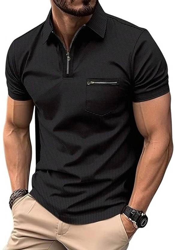 COMBRAIDED Self Design Men Polo Neck Black T-Shirt
