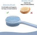 MATERIALS--Silicone bristles body brush are ultra-soft and easy clean, quick dry and no residue that reducing breeding of germs, more healthy for your life. The soft silicone bristles remove dead skin and leave it feeling smoother, will never hurt your skin and good for sensitive skin, and help to deep clean your body., DUAL-USE DESIGN--One side soft silicone brush fully accumulates foam for efficient cleaning, gives you an awesome and wonderful bath experience. The other side with cylindrical touch points promote blood circulation and deep massage., ERGONMIC LONG HANDLE--Reasonable ergonomic with 11.1 inch long handle design helps you save labor. The rubberized handle provides an anti-slip, comfortable grip so you can easily massage and clean your skin., EASY STORAGE--The long-handle portable brush is equipped with a pre-built lanyard hook for hanging when not use. You can hang the bath brush for easy storage on any hook in your bathroom.