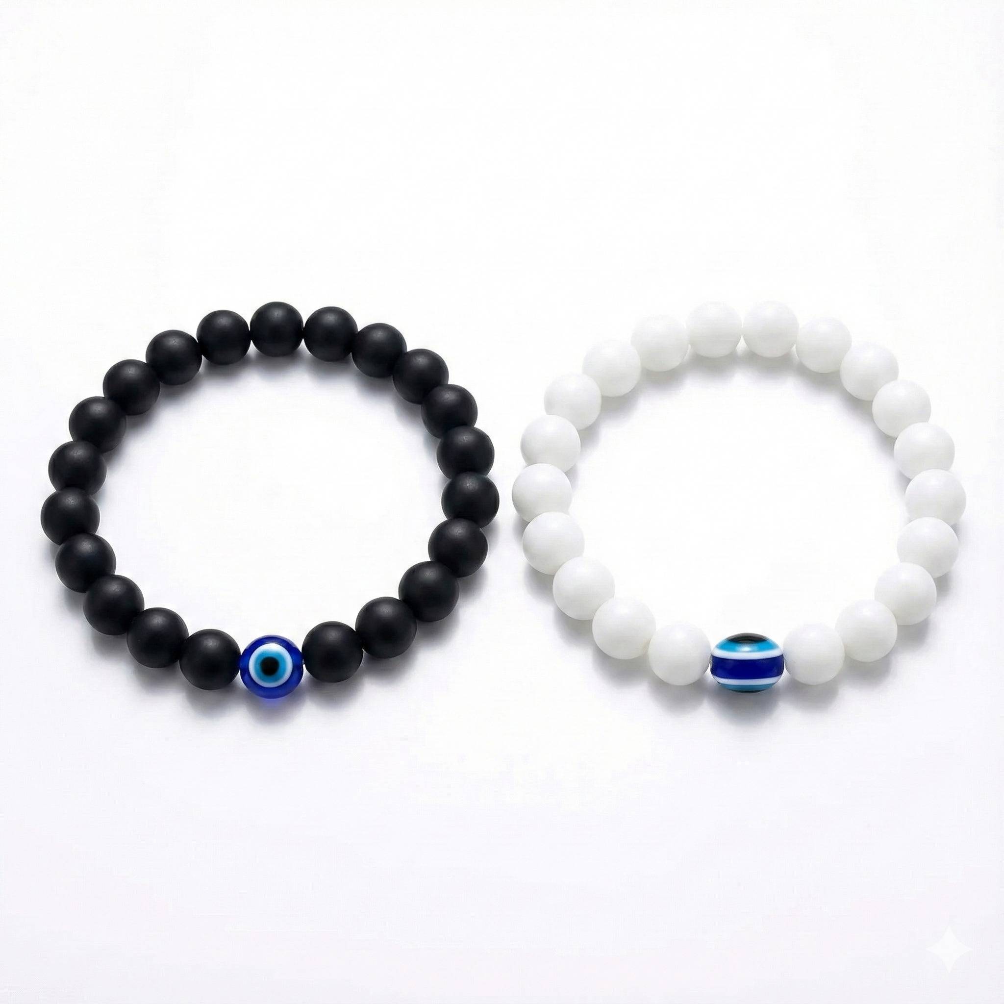 This set includes two contrasting bracelets: one in sleek Matte Black and one in pristine White. Each bracelet is centered with a traditional Blue Evil Eye (Nazar) bead, an ancient talisman believed to protect the wearer from negative energy and bad luck.