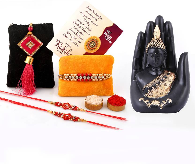Buddha Idol, Rakhi for Bhiya & Bhabi, 2 Rakhi for Children, Roli Rice Pack, Greeting