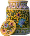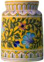 1Ltr yellow vintage food jar is one creative handmade pottery design that will embellish your kitchen decor. It is hand-painted with delicate floral designs in green and blue complementing well with the yellow jar. Infuse some ethnic designs and traditional style to your kitchen giving a new refined look. You can stack dry-fruits, munchies, snacks, pickle and other foods as it has enough capacity to store. The yellow lid with a knob helps easy access to open and cover the jar. It is a blue pottery jar made using natural substitutes and colored with natural dye making it safe for storing food. Get it for yourself or gift it to a friend on house warming it will be praised for its attractive look.