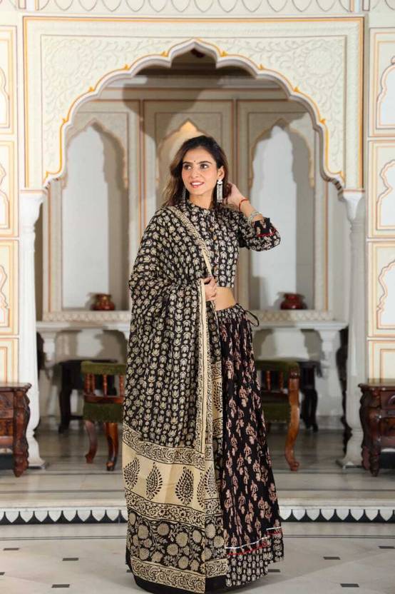 Bagru Hand Block Printed Designer Top & Skirt With Mulmul Dupatta. Pure Cotton Fabric Laingha Choli Size:- Top Sizes:- 34-46 (XXS to XXL) Laingha length: 40 inch Laingha Flair: 5.5 mtr. (28 Kali) Top length: 16-17 inch Dupptta size -2.5 mtr