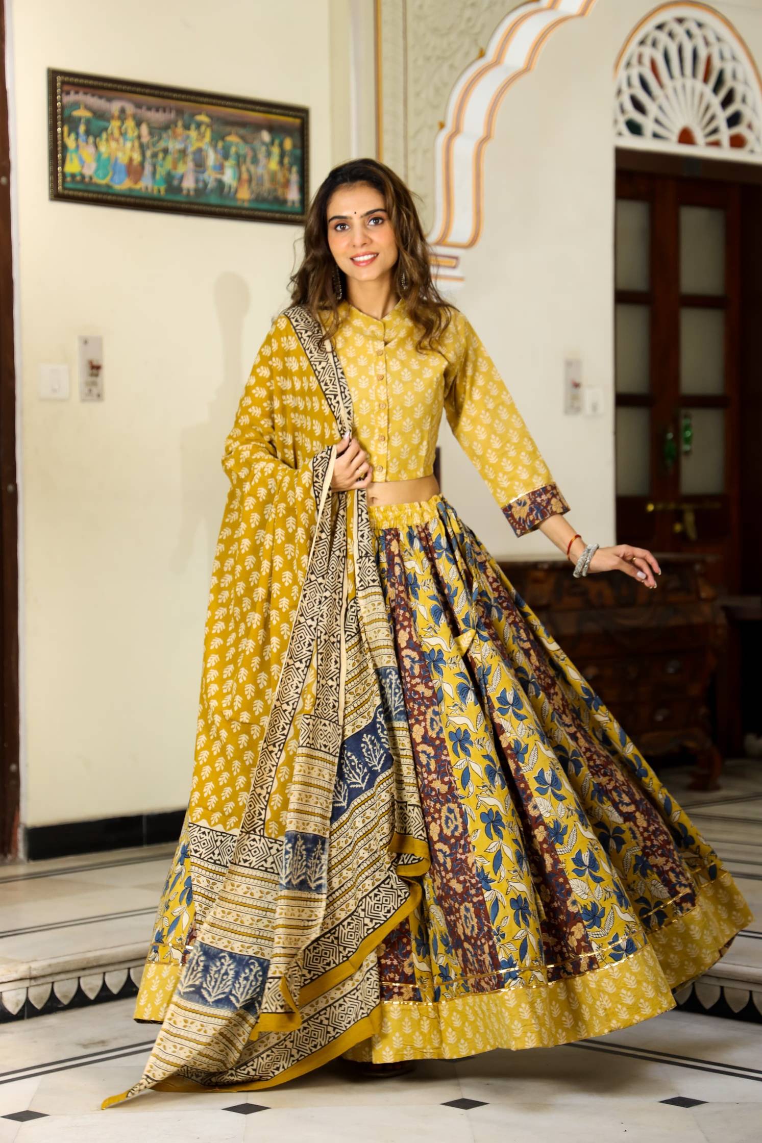 Bagru Hand Block Printed Designer Top & Skirt With Mulmul Dupatta. Pure Cotton Fabric Laingha Choli Size:- Top Sizes:- 34-46 (XXS to XXL) Laingha length: 40 inch Laingha Flair: 5.5 mtr. (28 Kali) Top length: 16-17 inch Dupptta size -2.5 mtr