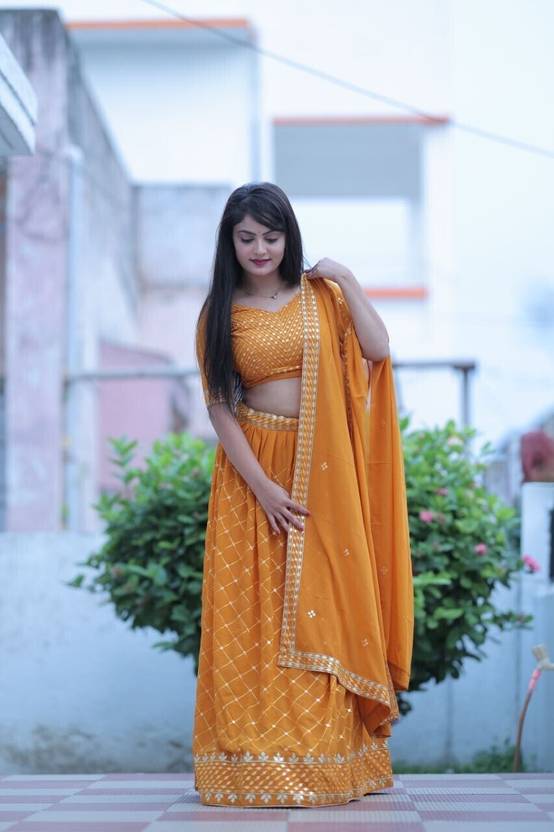 Embroidered Attractive Party Wear Silk Lehenga choli has a Regular-fit and is Made From High-Grade Fabrics And Yarn. *Lehenga Fabric* : - Fox Georgette 7 mm Sequence Work. *Dupatta Fabric* : - Heavy Net, Sequence 7mm With Fancy Border (Dupatta size 2.25 MIter) *Blouse Fabric* : - Fox Georgette, Sequence 7mm Work *Lehenga Inner* : - Micro Silk *Blouse Work* : -Sequence 7mm Sequence Work, Embroidery Work, Zari Work. *Lehenga Work* : - Zari Work, Sequence 7mm Sequence Work, Embroidery Work, Zari Work. Top Kamar Less *Type* : Lehenga :-Semi Stitched, *Blouse* :- Unstitched *OCCASIONS* : - Festival, Party, Traditional, Wedding, Dulhan Lehenga , Bridal Lehenga, Marriage Special, Party Wear, Lehenga *Size* : -Free Size, Lehenga: Length-42" Inches Width-up To 42 to 44". Flair Bottom-up to 2.80 Mtr.