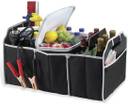 car trunk organizer has large compartments with side pockets to hold tools, supplies or groceries safely in place while you drive.The non-slip pads prevent shifting during transport for added protection. When not in use, the lightweight trunk organizer folds up neatly for easy storage. Protect tools, supplies, groceries. Easily folds down when not in use Large compartments and side pockets Nonslip pads prevent shifting when car is in motion.Three section collapsible organizer with removable insulated cooler.With handles for easy carrying, adding much convenience. Great for your Trunk or back seat. Leak-proof thermal shield insulated cooler keeps food and drink at the perfect temperature.Includes mesh pocket - Great for storing maps & newspapers.Package includes: 1 x Car Storage Box