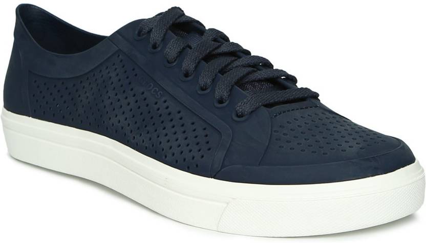 A pair of round-toe navy blue sneakers, has regular styling, lace-up detailSynthetic upperCushioned footbedTextured and patterned outsoleWarranty: 3 monthsWarranty provided by brand/manufacturerComes with an additional pair of laces. Show off your awesome sense of style with a pair of trendy Crocs casual shoes. Style this navy blue pair with dark denims and a graphic tee for a chill look for the weekend.