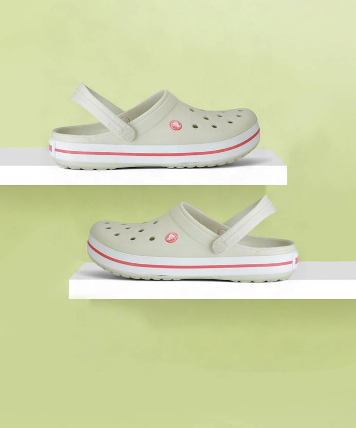 A pair of Beige clogsBold midsole stripe for a sporty look.Odor-resistant, easy to clean, and quick to dry.Ventilation ports for enhanced breathability.Lightweight, non-marking soles.Water-friendly and buoyant; weighs only ounces.Fully molded Croslitenbsp;material for lightweight cushioning and comfort.Heel strap swings back for snug fit, forward for wear as a clog.. Vintage style and classic Crocs comfort. Our lightweight Crocband clog is built with signature Croslite material for a form-to-foot fit and heel straps that swing back for a snug fit and forward or wear as a clog.