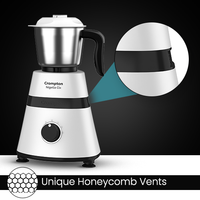 This Crompton Mixer Grinder features a 500 W Powertron motor to ensure efficient performance and maximum energy use. Vent-X technology for better airflow also cools the motor and increases lifespan. Overheating is avoided through the overload protection switch, and precise control is ensured through the inbuilt pulse switch. Operating at a speed of 22,000 RPM, it ensures quicker grinding. Honeycomb vents, heavy jars, and space-saving design make it ensure style, stability, and durability for daily use.