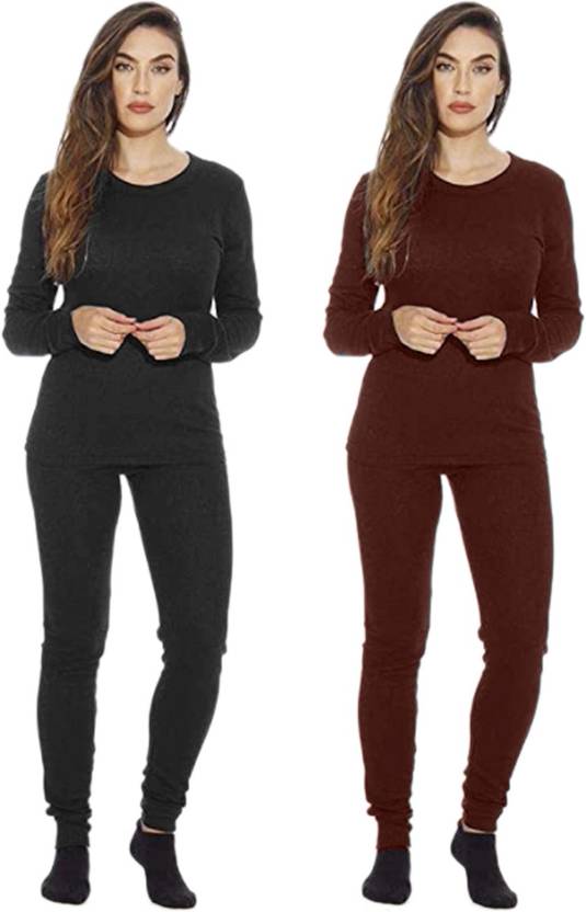 CROTUS Women Winters Woolen Thermal Wear Top Upper Lower Inner Set | Round Neck Fleece Thermal Wear Set | Winter Body Warmer Black & Brown Combo of 2 (Size–38) Women Top - Pyjama Set Thermal