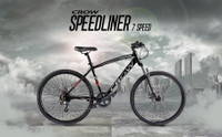 Crafted on a sturdy 46.99 cm (18.5) hi-tensile steel frame for durability, the Crow Speedliner Seven Speed Hybrid bike boasts Shimano's Tourney rear derailleur and user-friendly Shimano shifters, ensuring optimal performance.
