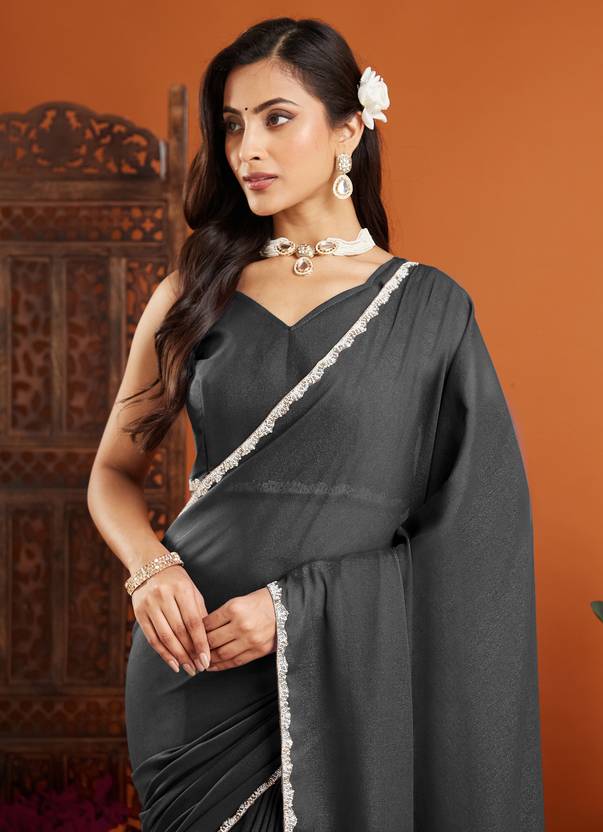 Fabric: Pure Silk, Saree Length: 5.5 metres, Blouse Piece: 0.8 metres (Unstitched), Work / Design: Sparkling Beads & Stone Embroidery, Pattern: Plain Solid with Chic Finish, Occasion: Parties / Weddings / Festive Events, Package Includes: Saree + Blouse Piece