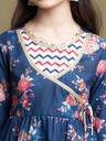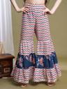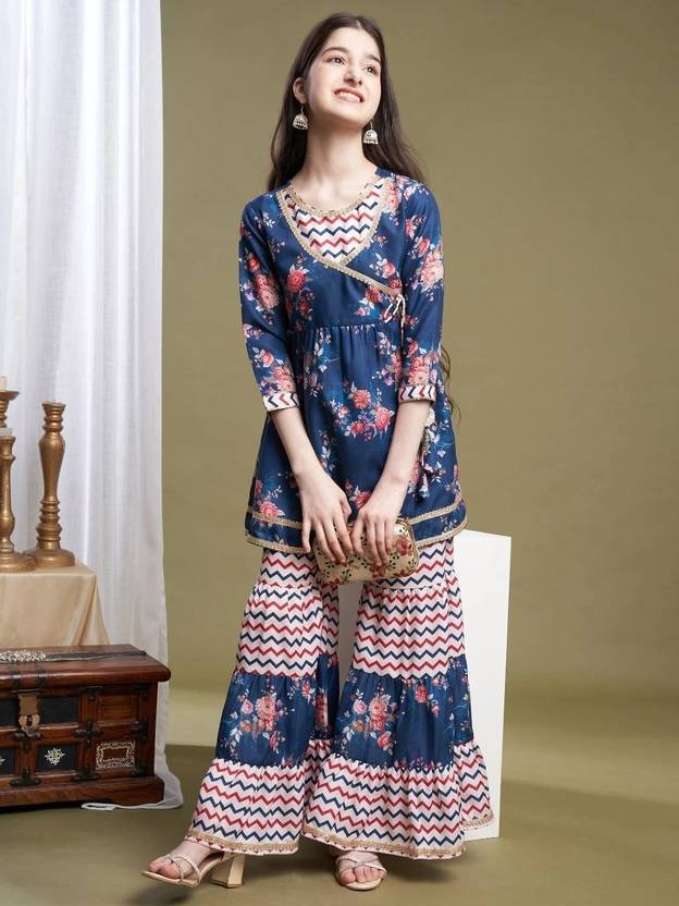 This Angarkha and Sharara set is made from soft, durable polycotton fabric, featuring a floral print that adds a vibrant, festive touch. The outfit includes a traditional Angarkha top with a round neck and 3/4 sleeves, paired with flowy Sharara pants for an elegant silhouette. The design incorporates lace detailing for a sophisticated, feminine look. Perfect for festive and party occasions, it combines comfort with style. The set is easy to maintain with machine wash convenience.