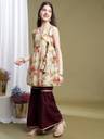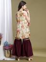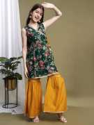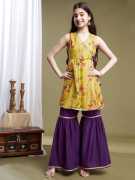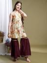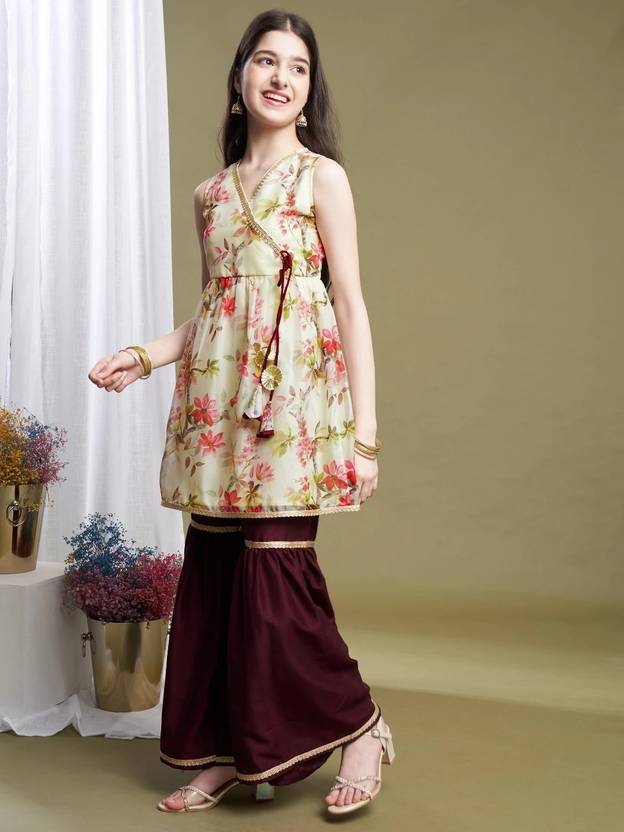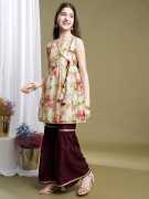 Add a splash of vibrant charm to your ethnic wardrobe with this stunning mustard floral printed kurti and sharara set for girls. Crafted from soft, breathable fabric, the sleeveless kurti features a flattering V-neck, side tie-up detail, and elegant gold lace accents. The contrasting maroon sharara pants offer a comfortable flare with a touch of traditional glam. Perfect for festive occasions, weddings, or family gatherings, this ensemble blends comfort and style effortlessly. Pair with jhumkas and sandals for a complete ethnic look!