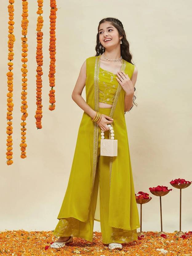 Add festive charm to your girl's wardrobe with this stunning ethnic set. Featuring a sleeveless embroidered inner top, matching floral embroidered palazzo pants and a long embellished jacket-style shrug, this outfit blends elegance with tradition. Made from soft, flowy fabric, it ensures all-day comfort with a stylish fit. Detailed with zari and thread embroidery, this stitched set is perfect for weddings, celebrations and cultural events. The rich color and intricate ornamentation make it a standout choice for every festive occasion.