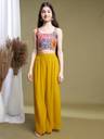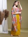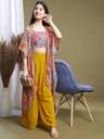The Kaftan Shrug Blouse Palazzo Set for girls is a stunning and contemporary ensemble designed to add a touch of elegance to any festival or party. This stylish outfit features a flowy kaftan shrug and blouse crafted from lightweight georgette fabric, paired with matching palazzo pants, also made from soft georgette for a breezy, comfortable fit. The inner lining of crepe ensures added comfort and a smooth finish. Adorned with exquisite digital and floral prints, the set radiates a vibrant and festive charm, while delicate lace work adds a hint of sophistication. The blouse features a classic round neckline and half sleeves, perfectly balancing modern style with traditional aesthetics. This ensemble is an ideal choice for young girls who love to showcase a chic and graceful look, making it a standout option for any special occasion.