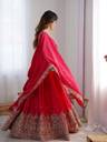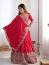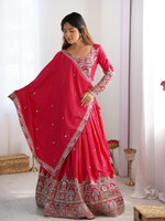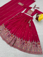 Make a regal statement with this breathtaking cherry pink lehenga choli set, a perfect blend of tradition, elegance, and contemporary charm. Crafted from luxurious fabric, the lehenga features exquisite mirror and thread embroidery depicting traditional temple motifs and floral patterns along the wide border. The voluminous flare adds graceful movement, making it ideal for festive twirls and grand entrances. The matching choli is designed with intricate handwork and mirror embellishments, enhancing the neckline and sleeves for a royal appeal. Complemented with a beautifully adorned dupatta featuring delicate butis and a heavily embroidered border, this ensemble is perfect for weddings, festivals, and special occasions. Style this set with traditional jewelry, statement bangles, and embroidered juttis to complete your festive look. Be ready to turn heads and steal the spotlight in this enchanting outfit.