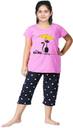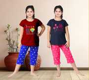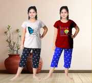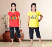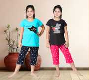 Trendy and colourful, this night suit is all your little kiddo needs this summer. Comfortable to wear, this set will become her favourite in no time. Half sleeves top with round neck and graphics printed brings you refreshing feel for your nights. A Classic and Comfortable allover printed Capri set to add to your lounge wear collections. Girl's Cotton Embroidered Capri set - Night Suite for girls, comfortable night wear for girls,can be used for daily use as well