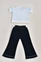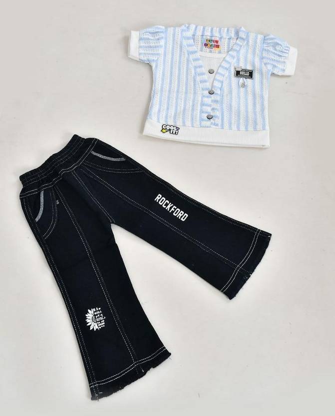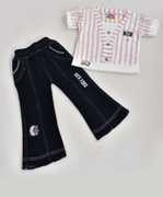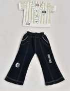 THIS IS A TWO PEICE OUTFIT CONSISTING OF A SHORT SLEEVED TOP AND BLACK DENIM PANT.THEY ARE STYLED WITH AN ELASTICED WAIST AND A SLIGHT BOOT CUT AT THE HEM.OVERALL THIS PRODUCT IS FOR READY TO GO WEAR FOR BABY GIRLS,THIS COMBINATIONED IS DESIGNED FOR A CASUAL&ALSO A PARTY WEAR.
