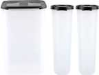 These containers are made of high quality plastic and are safe for storing food items. The storage quantity is good enough. The lid closes tightly so it is air tight but not too tight as it is convenient for opening and closing easily. Fits in most average sized kitchen cabinets. Price is fine for such high quality product