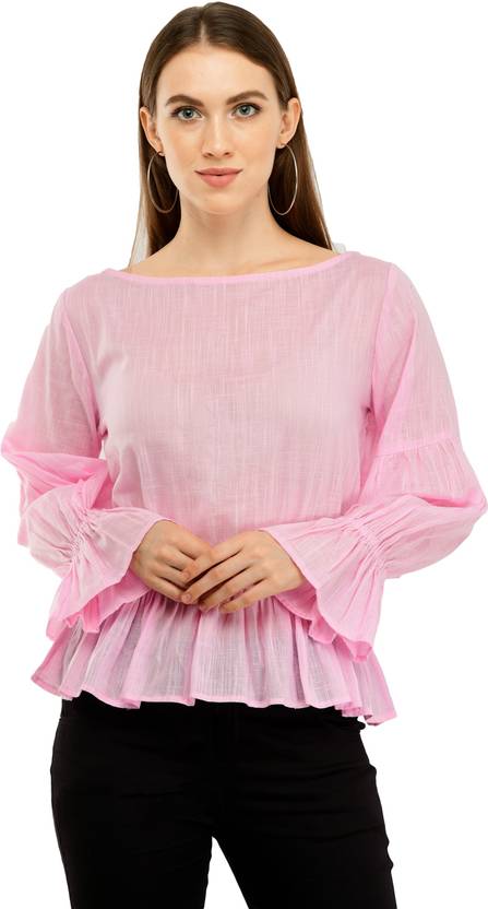 Cwtch Casual Bell Sleeves Self Design, Solid Women Pink Top