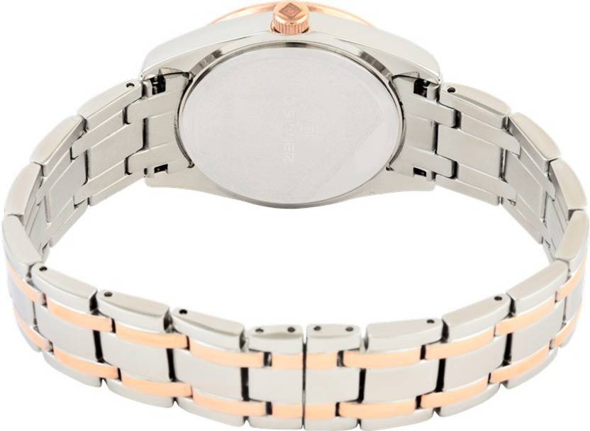 Brought too you from the house of D'Signer watches are quartz movement with manufacturer's warranty at affordable prices.case style:analogue watch,with a round shape studded with stone case,has a stainless steel. dial style:round shape dial color Rose,studded with stone with a date window at 3. in the surface,feature: A Screw at the position of 3 to reset the time. strap style,twotone Metal band secured with a tang clasp water resistant up to 30 m. warranty: 1 year battery,1 year movement , and 6 month plating.