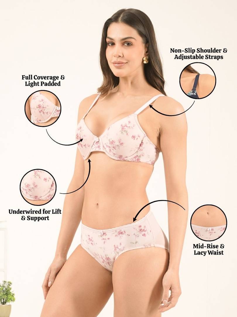Cotton Lightly Padded Wired Full Coverage Floral Printed Bra & Panty Set Lingerie Set