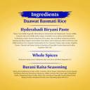 | Additives | - Daawat Basmati Rice, Hyderabadi Biryani Paste, Aromatic Whole Spices, and Burani Raita Seasoning.