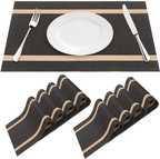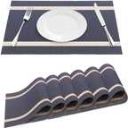 These Placemats from daiDokoro are Non-Slip Insulation Heat-Resistant & Waterproof Stain Resistant Washable Placemat for Dining & Kitchen Table. Made of Vinyl & Polyester, safe to contact with food directly. 10% thicker than a normal placemat and won't crisp, or deform. Ultra-durable, UV resistant, and fadeless for both indoor and outdoor long-term everyday use. These heat-resistant placemats are washable, just wipe off the stains stuck on them, if needed, brush or hand wash in soapy water, and then wipe dry or hang dry, it will dry quickly without fading or shrinking. (Please DO NOT wash in a washing machine). This table mat is precisely woven and hot-pressed with no rough selvage, meanwhile, it can be cut or bent freely without raveling. HEAT-RESISTCANT and SKID-RESISTCANT, provide an effective heat barrier to protect your table. This Washable Vinyl Placemat is definitely a perfect shield and decor for your table in the dining hall, kitchen, restaurant, coffee shop, hotel, or even business office. Not only used as a heat-resistant placemat, but also a skid-proof mat or a dust-proof mat for a worktop or a drawer.