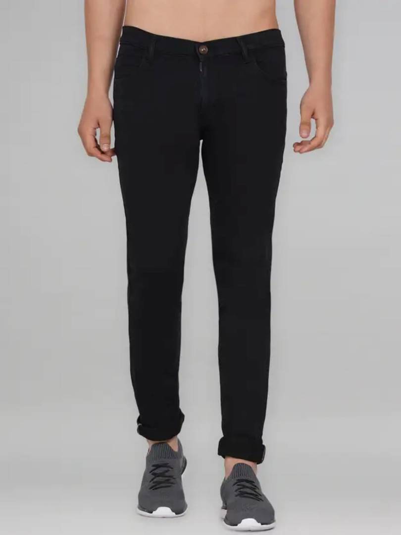 These are classic black slim-fit jeans for men, featuring a clean, non-distressed look. They come with a traditional five-pocket design, offering a versatile style that can be easily dressed up or down. Compatible products include t-shirts, casual shirts, hoodies, jackets, and various types of footwear like sneakers, boots, or loafers, black jeans