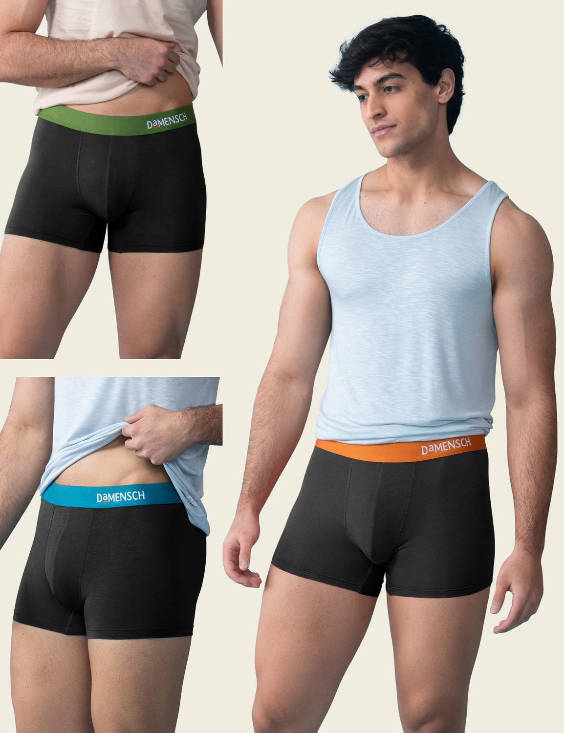 2) No fading: Rich colors that last a lifetime. 3) 2X Moisture wicking & anti bacterial Keeps you cool inside with no odour. 4) Mid-rise 4-way stretch Micro Modal fabric: Body responsive fit that sits mid-way over the hips. 5) Superior Microfibre waistband - A matte finish microfiber strap that loves you back.