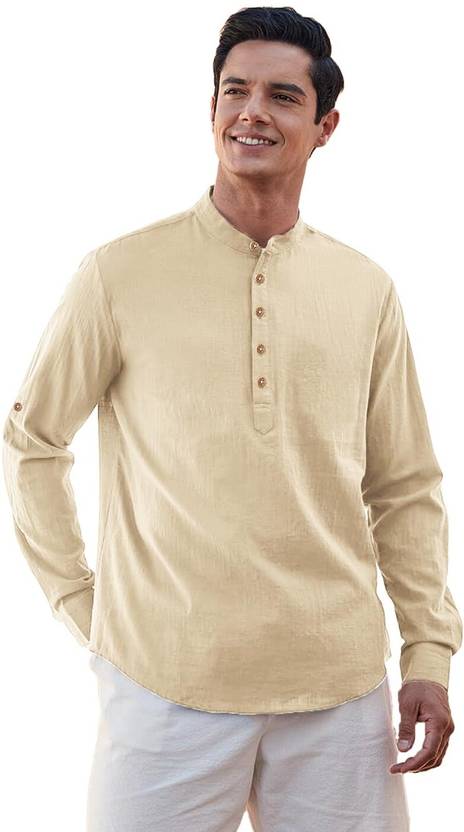 FireFish Men Solid Cotton Blend A-line Kurta (Beige)