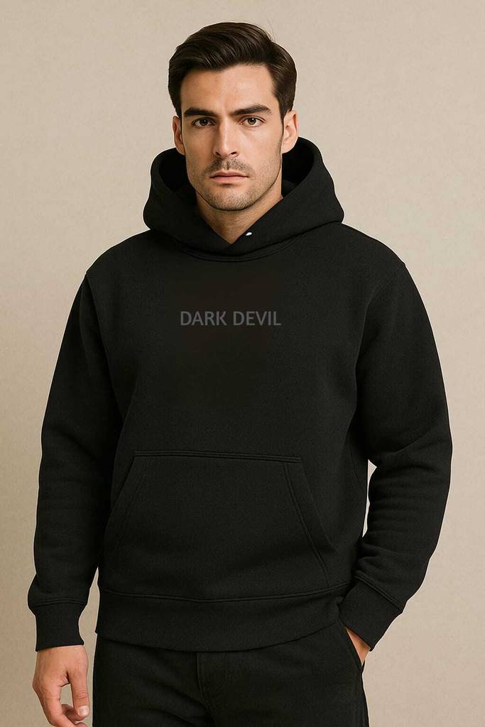 Introducing the bold and stylish Dark Devil Men’s Black Cotton Fleece Hoodie, a winter wardrobe essential crafted for those who appreciate comfort, durability, and an edge of street-style fashion. Made with premium-grade cotton fleece, this hoodie delivers exceptional warmth while remaining breathable and lightweight, making it ideal for long hours of wear during cold weather. The solid black color offers a clean, versatile look that effortlessly complements every outfit, while the minimal yet impactful “DARK DEVIL” text branding on the chest adds a statement-making element without being overly flashy. Its hooded neck with adjustable drawstrings ensures a secure and customizable fit, offering protection against chilly winds while enhancing the streetwear-inspired silhouette. The kangaroo-style front pocket provides ample room to keep your hands warm or carry everyday essentials such as a phone, wallet, or keys. Designed with ribbed cuffs and hem, the hoodie locks in warmth and offers a snug fit that keeps its shape even after multiple washes. This pullover hoodie is tailored in a regular fit, allowing for easy movement and layering, making it perfect for casual outings, gym sessions, daily errands, college wear, travel, or lounging at home. The soft brushed interior enhances comfort, while the fleece knit type ensures excellent insulation, ideal for heavy winter wear. Whether you pair it with joggers, jeans, or activewear, this hoodie makes a sharp impression with its blend of functionality and urban fashion. Perfectly suited for men who want to stay warm without compromising on style, this hoodie is available in multiple sizes – Small (S), Medium (M), Large (L), Extra Large (XL), and Double Extra Large (XXL) – ensuring a perfect fit for all body types and preferences. From early morning runs to late-night hangouts, this all-purpose hoodie transitions effortlessly across occasions. Its no-closure design offers easy slip-on convenience, and the high-quality fabric retains its shape, color, and softness even after repeated use and machine washes. Ideal for those who appreciate minimalist fashion with a bold twist, the Dark Devil black hoodie reflects confidence, masculinity, and comfort – all wrapped in one stylish silhouette. Whether you're heading to a café, hitting the gym, or just taking a walk in the winter breeze, this hoodie keeps you warm, comfortable, and on-trend. Elevate your wardrobe with this must-have winter essential that combines premium material, trendy design, and unmatched comfort. Dark Devil – because your hoodie should speak for your attitude.