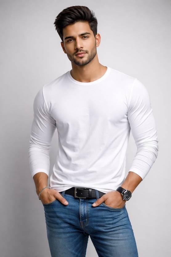 Men Solid Round Neck Cotton Blend White T-Shirt