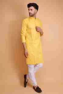 Tibra Collection Men Solid Cotton Blend Straight Kurta Yellow