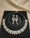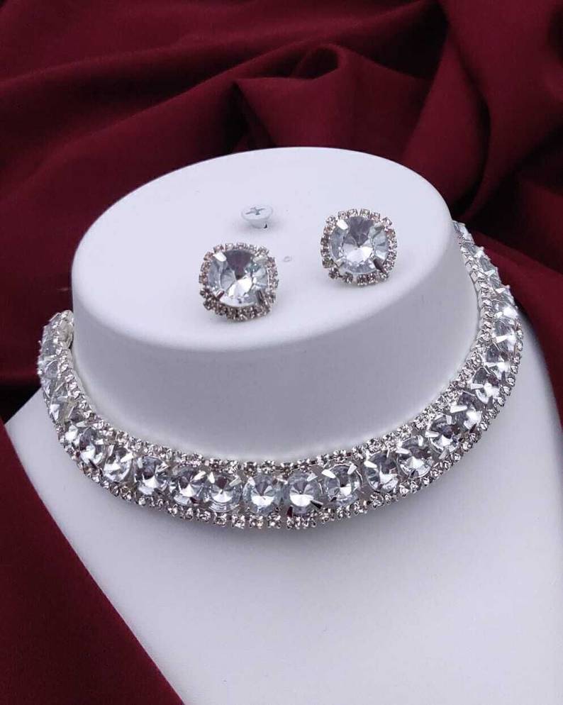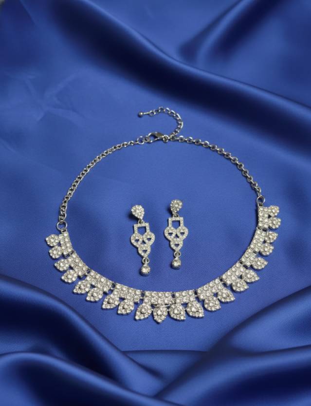 This is an elegant silver-tone necklace and earring set adorned with multiple shimmering rhinestones.