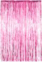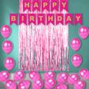 • HAPPY BIRTHDAY PRINT IN GOLD COLOR ON DARK PINK M SHAPE BANNER, PASTEL PINK CURTAINS, PINK METALLIC LATEX BALLOONS