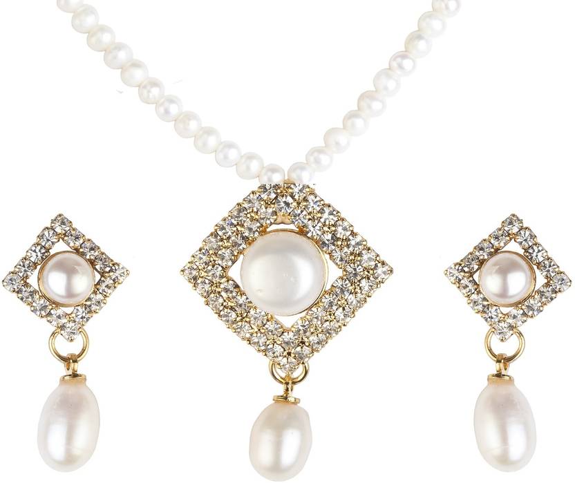 DD Pearls white AA freshwater pearls string with beautiful american diamond pendant and droplets earring for women and girls.
