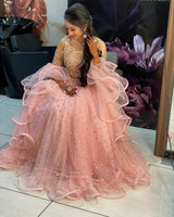 The whole pair is covered in beautiful sequinned embellishments. The blouse is covered with beautiful rhinestones. The dupatta has a stylish ruffled pattern that makes it stand out. The lehenga is covered with sparkling stones. Be it a day or night look; this can be paired at any time of the day.
