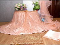 The skirt and the dupatta come with a dainty net fabric. The lehenga skirt has a satin underskirt to protect the delicate net fabric and provide shape and flow to it. The choli comes in velvet that pairs with the soft net cloth of the dupatta and the skirt well.