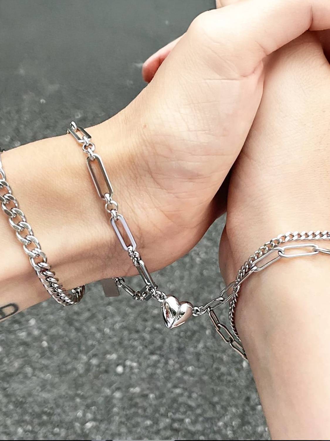 Stainless Steel Trending Metal I Love You 2 Pcs Magnetic Valentines Day Special Mutual Attraction Relationship Forever Matching Broken Heart Shape Romantic Love Couples Promise Friendship 2 In 1 Duo Wrist Band Cuff Double Layer Thick Link Chain Bracelets For Men And Women/Boyfriend & Girlfriend Gift Jewellery Set