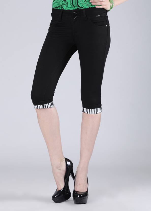 Go high in style this season as you slip into this pair of chic black capris from Deal Jeans that comes with contrast roll-up cuffs to further accentuate your appeal. Style it with ruffled sleeveless tops and pumps and sling a flap bag.