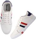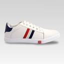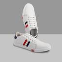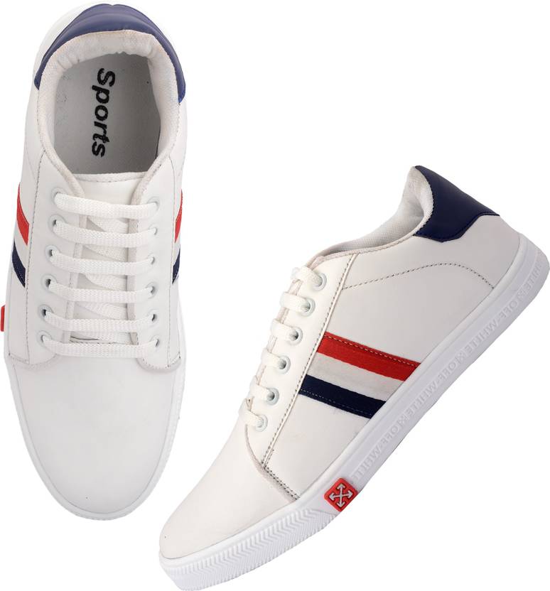 Solid sport shoe for men's with red & blue strip design. Shoe Size-9. Crafted to perfection with artificial leather in White tone. Rubber sole quality makes the shoes safer and adds more comfort for wearing it. Trendy, stylish and COMFORTABLE ballet flats ideal to for daily use, college wear, etc. So versatile.. that it goes with western,Gym as well as casual outfits!