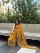 Step into timeless elegance with stunning inspired Tissue SilkSaree, designed to turn heads at every occasion. Crafted from premium tissue silk, it features a luxurious shimmer with intricate Khatli work border for a royal finish. The rich mustard blouse paired with the glossy dual-tone saree creates a flawless contrast, perfect for festive and evening wear. Lightweight, breathable, and effortlessly stylish — this saree redefines glam in every drape.