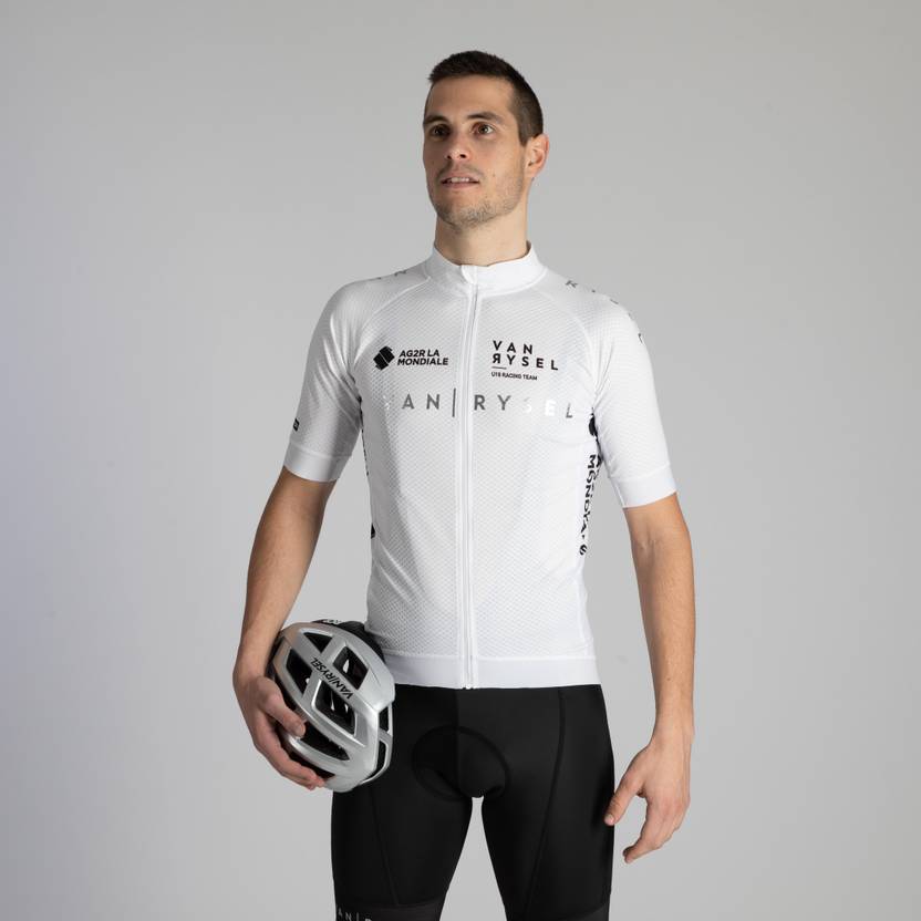 Created for competition by competitors, our sport cycling jersey is designed for cyclists wanting a high-performance jersey for hot weather.. Inspired by the demands of racing, this VAN RYSEL AG2R LA MONDIALE U19 jersey is close-fitting, well ventilated, and has a bin pocket for longer rides.
