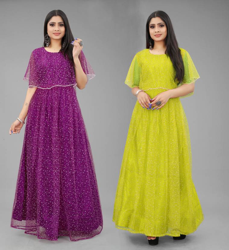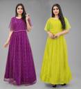 DECOFIN Self Design, Embellished Net Semi Stitched Flared/A-line Gown (Purple, Yellow)