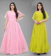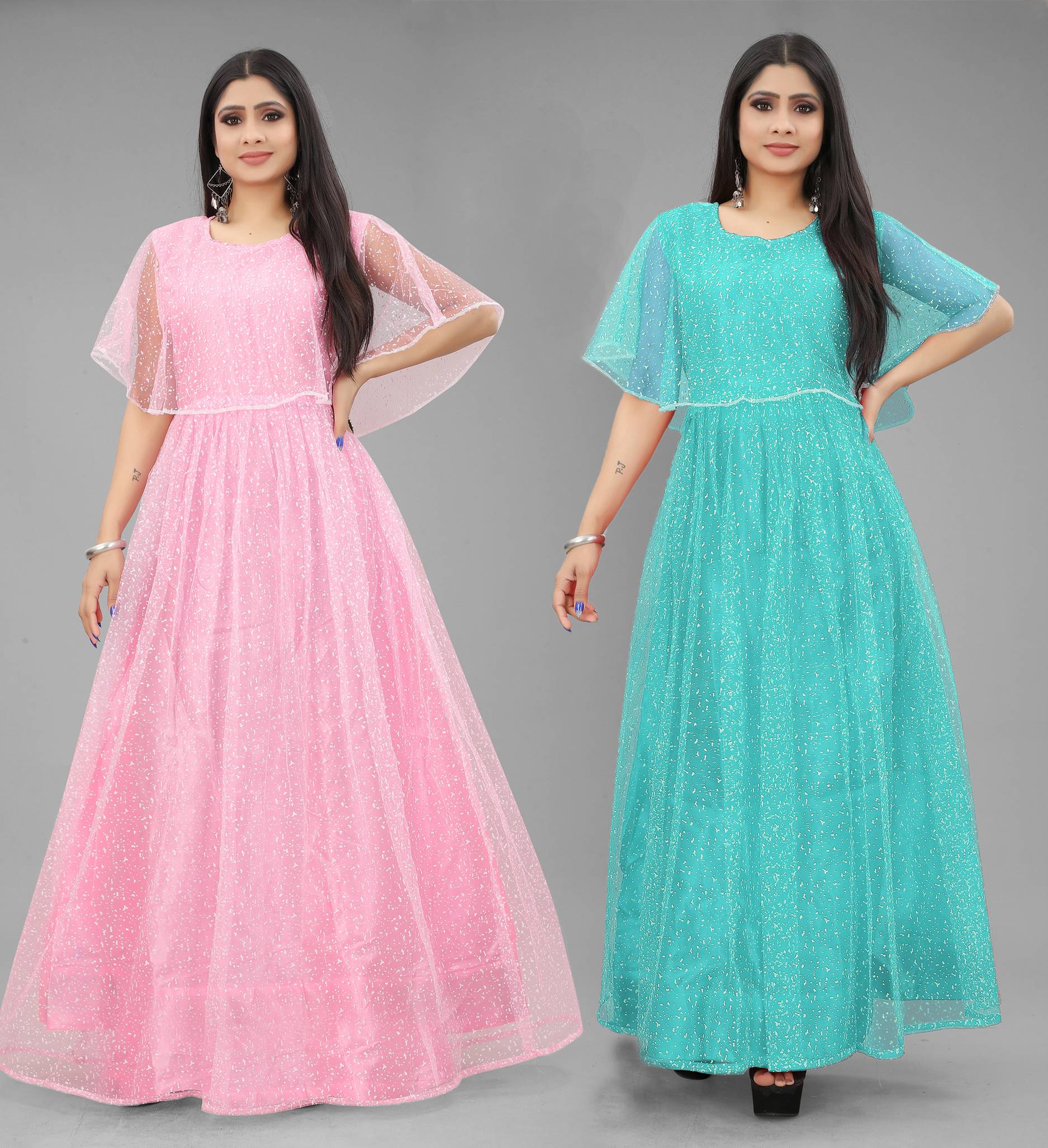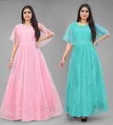 DECOFIN Self Design, Embellished Net Semi Stitched Flared/A-line Gown (Pink, Light Blue)